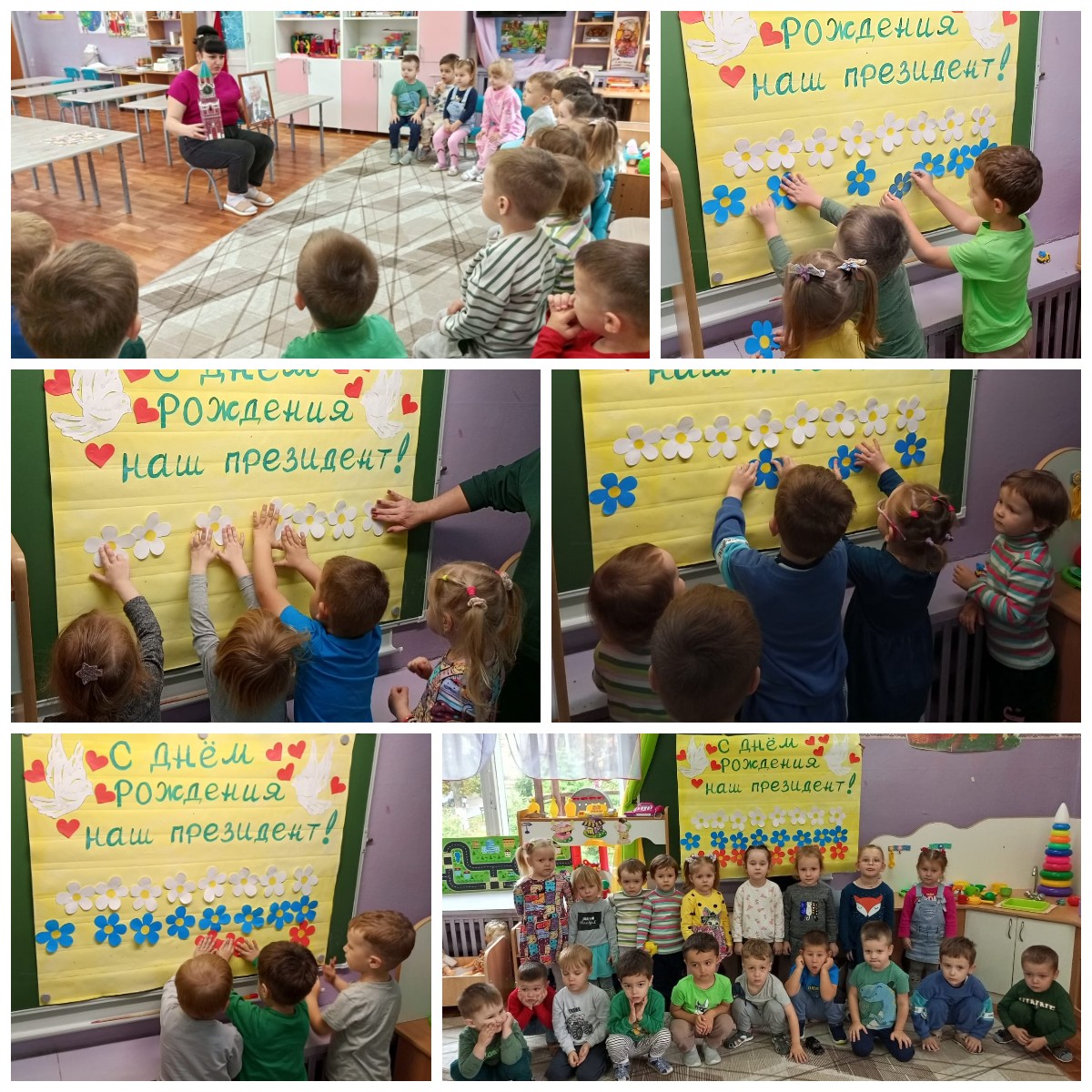 Сегодня в младшей группе "Изюминки" отмечали День Рождения Президента! "Изюминки" узнали, кто такой Президент, чем он занимается и где работает. Вместе ребята создали яркий коллаж с надписью "С Днем Рождения Президент!", украшенный белыми, синими и красными цветами. Вот так весело и познавательно прошло наше мероприятие!