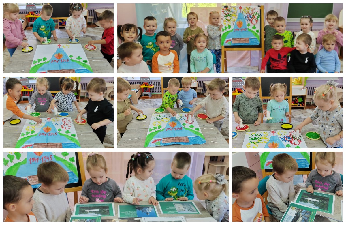 Накануне дня освобождения Брянщины от немецко-фашистских захватчиков воспитанники младшей группы «Изюминки» приняли участие в творческой акции памяти. Ребята нарисовали яркий и трогательный коллективный рисунок — праздничный салют. Вместо привычных кистей дети использовали необычные инструменты — картонные втулки, превратив их в оригинальные художественные средства. Это мероприятие стало частью патриотического воспитания малышей, позволяя детям выразить своё уважение подвигу предков и гордость за свою Родину.